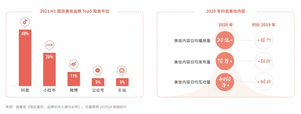 第一,新國貨美妝品牌擁抱新的投放渠道,抖音成半數(shù)品牌線上投放的選擇。