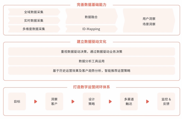 總結(jié)來說,新國貨美妝品牌在提升數(shù)字化運(yùn)營能力上應(yīng)把握三個(gè)關(guān)鍵舉措:完善數(shù)據(jù)基礎(chǔ)能力、建立數(shù)據(jù)驅(qū)動(dòng)文化、打造數(shù)字運(yùn)營閉環(huán)體系,如下: