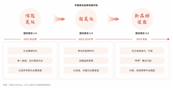 伴隨著大眾媒體、移動(dòng)互聯(lián)網(wǎng)、社交電商的發(fā)展與升級(jí),中國美妝品牌經(jīng)歷了“傳統(tǒng)美妝→淘美妝→新品牌逆襲”的過程。目前,國貨美妝已經(jīng)迎來 3.0 時(shí)期,依托社交電商占領(lǐng)消費(fèi)者心智。