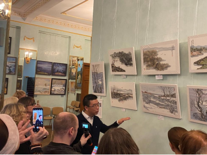 開幕當天,畫家劉子輿受邀走進俄羅斯國家科學院“大師課堂”,教授俄羅斯學員創(chuàng)作中國水墨畫。學員不少是俄羅斯知名的專業(yè)油畫家。劉子輿從畫面構(gòu)圖、運筆、調(diào)墨、調(diào)色等方面進行深入講解,現(xiàn)場示范中國繪畫技巧,墨色在宣紙上產(chǎn)生濃淡變化,學員們很驚喜,非常感謝劉子輿帶領他們體驗了東方藝術之美。