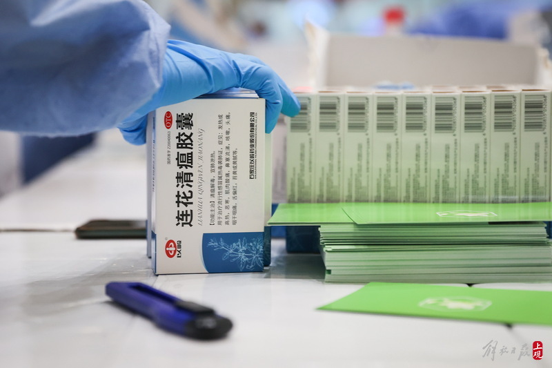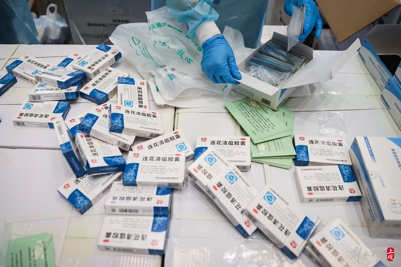 每個(gè)服務(wù)包內(nèi)有口罩、連花清瘟膠囊、抗原測(cè)試盒,并附有一張上海市疫情防控工作領(lǐng)導(dǎo)小組辦公室的心意卡。