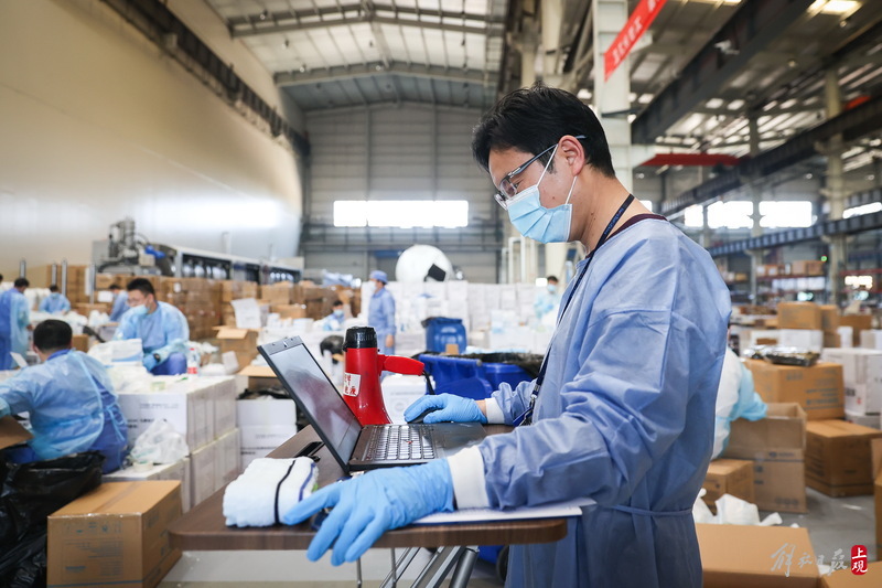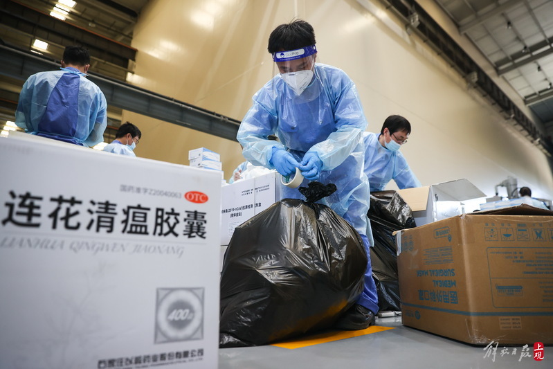 為不增加基層負(fù)擔(dān),寶山區(qū)啟用7個(gè)分揀點(diǎn)對(duì)應(yīng)13個(gè)街鎮(zhèn)園區(qū),由招募來(lái)的企業(yè)職工及志愿者流水線作業(yè),對(duì)物資開(kāi)展卸貨、分裝。