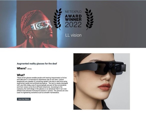 值得關(guān)注的是,在今年的評選中,亮亮視野智能AR字幕眼鏡成為唯一入選該獎的中國代表,也是AR領(lǐng)域的唯一代表。在活動期間Netexplo論壇官網(wǎng)面向全球觀眾進行了一個投票活動,從10項創(chuàng)新中選出年度最佳創(chuàng)新成果,亮亮視野智能AR字幕眼鏡脫穎而出,與第一名票數(shù)極其接近,獲得第二名,彰顯了大眾對它的肯定和期待。