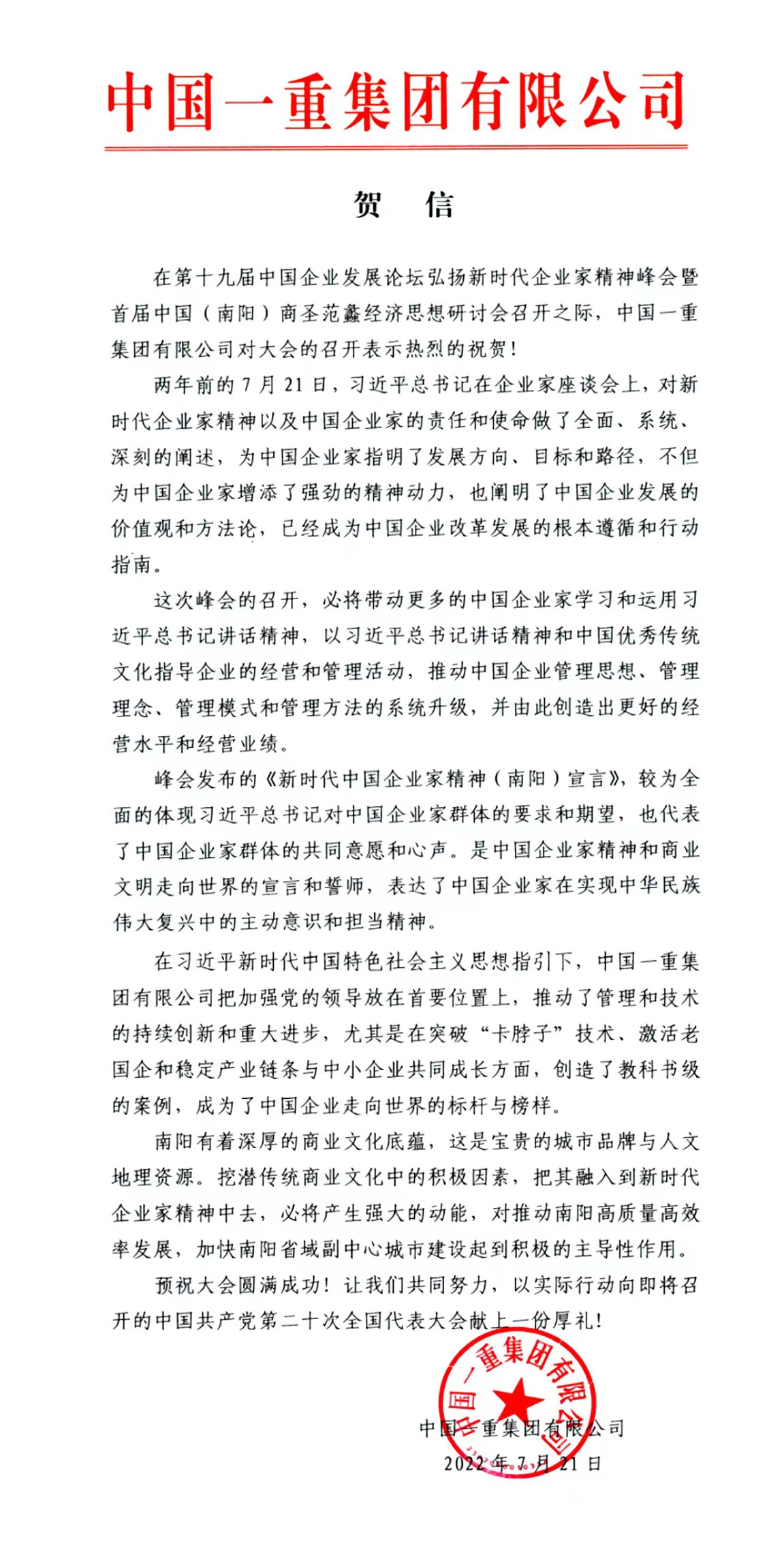 7月21日—7月22日,以“傳承中華優(yōu)秀文化,弘揚新時代企業(yè)家精神”為主題的第十九屆中國企業(yè)發(fā)展論壇弘揚新時代企業(yè)家精神峰會暨首屆中國(南陽)商圣范蠡經(jīng)濟(jì)文化研討會在河南省南陽市舉辦。本次研討會由中國企業(yè)聯(lián)合會、中國企業(yè)家協(xié)會、中國企業(yè)文化促進(jìn)會指導(dǎo),南陽市人民政府、《中國企業(yè)報》集團(tuán)主辦,中共南陽市委宣傳部、南陽市工業(yè)和信息化局、南陽市招商投資促進(jìn)局、南陽理工學(xué)院、南陽市宛城區(qū)人民政府協(xié)辦?!吨袊髽I(yè)報》集團(tuán)副社長、副總裁張博宣讀中國一重集團(tuán)有限公司發(fā)來的賀信。