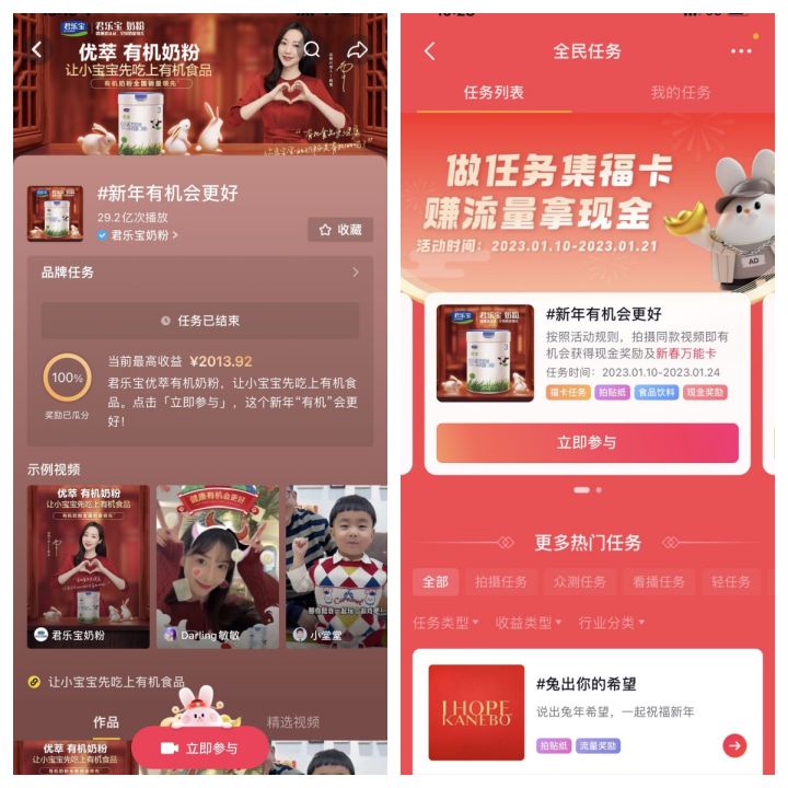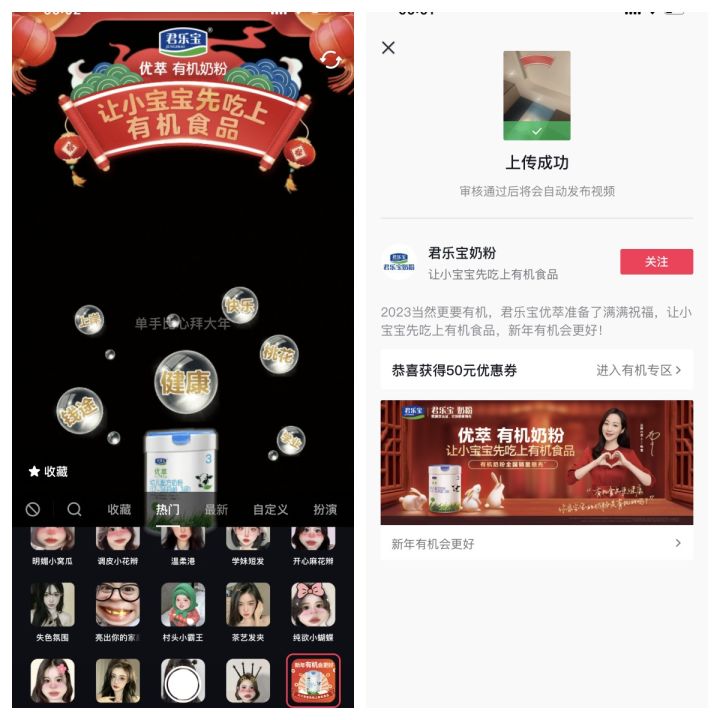 基于新一代母嬰人群所追求沉浸感和參與感,信賴場(chǎng)景式安利、沉浸式感受,因而優(yōu)萃有機(jī)奶粉攜手巨量引擎在基礎(chǔ)品牌信息的純曝光宣傳之外,共創(chuàng)了一系列多元互動(dòng)玩法,如找紅包、集節(jié)氣卡、挑戰(zhàn)賽貼紙等,在點(diǎn)燃新春氛圍的同時(shí)加深了品牌與用戶深度互動(dòng),尤其是在抖音上發(fā)起的 #新年有機(jī)會(huì)更好 的話題挑戰(zhàn)賽,優(yōu)萃有機(jī)奶粉的有機(jī)賣(mài)點(diǎn)持續(xù)多次露出,活動(dòng)各頁(yè)面上“優(yōu)萃有機(jī)奶粉,讓小寶寶先吃上有機(jī)食品”高度吸睛,最大程度覆蓋了用戶的目光所及之處,高密度投放且集中化曝光使得優(yōu)萃有機(jī)奶粉品牌價(jià)值理念在用戶心智中形成深刻記憶點(diǎn)。
