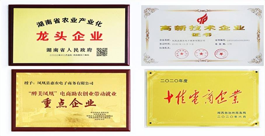2020 年, 公司獲得湖南省農(nóng)業(yè)龍頭企業(yè) 、湖南省電子商務(wù)企業(yè)、湖南省高新技術(shù)企業(yè)、鳳凰縣電商消費(fèi)扶貧新技術(shù)企業(yè)、鳳凰縣電商消費(fèi)扶貧示范企業(yè)、鳳凰縣電商助農(nóng)就業(yè)帶動(dòng)重點(diǎn)企業(yè)、湘西州十佳電商企業(yè)等榮譽(yù)稱號(hào)。