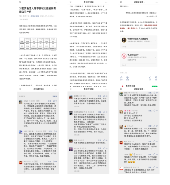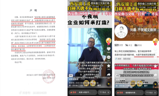 2023年3月16日,大唐不夜城官方率先在抖音、曲江文旅、大唐不夜城、曲江文化、微博、西安大唐不夜城等平臺(tái)官方認(rèn)證賬號(hào)上全網(wǎng)發(fā)布聲明,該聲明指出:發(fā)現(xiàn)網(wǎng)絡(luò)流傳的“西安“錦上添花”就是西安大唐不夜城的打造者”及“該集團(tuán)董事長劉磊為大唐不夜城項(xiàng)目策劃師”等不實(shí)消息,是假冒大唐不夜城品牌“該集團(tuán)及其相關(guān)人員打著該旗號(hào)欲與多家單位達(dá)成合作,該集團(tuán)及其相關(guān)人員虛假宣傳行為給我司已造成嚴(yán)重不良的社會(huì)影響?!?/p>