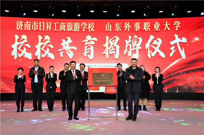 濟南市日昇工商旅游學校黨支部書記楊楠與山東外事職業(yè)大學副校長孫彤宇共同為山東外事職業(yè)大學“合作共建單位”揭牌。
