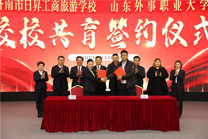 隨后,濟南市日昇工商旅游學校執(zhí)行校長管玉川與山東外事職業(yè)大學產(chǎn)教融合辦公室主任張榮家成功簽署校校共育協(xié)議。