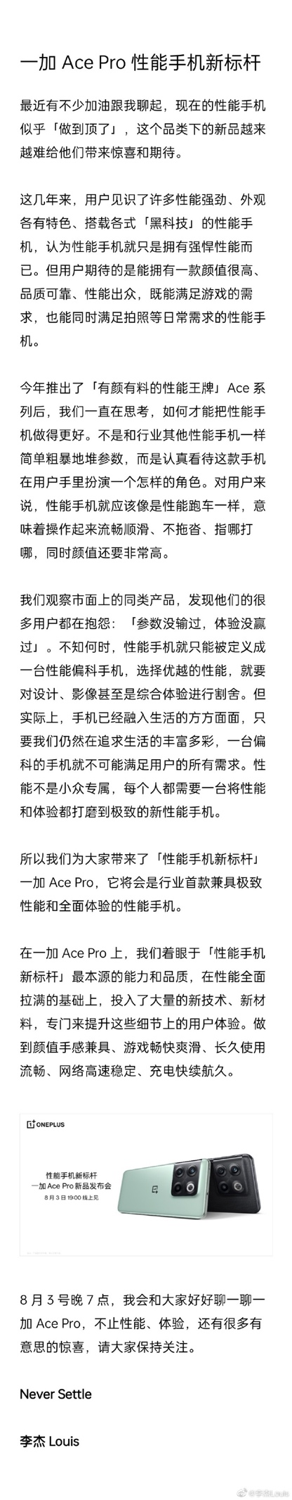 一加 Ace Pro定位“性能手機(jī)新標(biāo)桿”, 一加中國區(qū)總裁李杰表示不知何時,性能手機(jī)就只能被定義為一臺性能偏科手機(jī),選擇優(yōu)越的性能,就要對設(shè)計(jì)、影像甚至是綜合體驗(yàn)進(jìn)行割舍。李杰稱:每個人都需要一臺將性能和體驗(yàn)都打磨到極致的新性能手機(jī)。性能手機(jī)新標(biāo)桿一加 Ace Pro,將會是行業(yè)首款兼具極致性能和全面體驗(yàn)的性能手機(jī)。