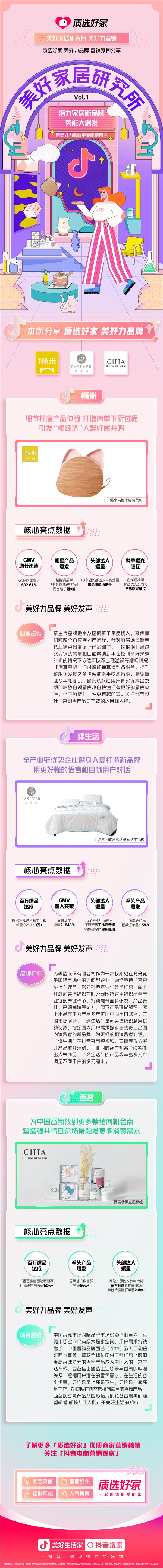 「質(zhì)選好家」喊出「一起創(chuàng)造你愛(ài)的家」這句口號(hào)一方面是對(duì)自己的要求另一方面也是對(duì)用戶(hù)的美好希冀,海量家居內(nèi)容、嚴(yán)格把控品質(zhì)、定制風(fēng)格隨心選、人氣創(chuàng)作者同款推薦,從選品、風(fēng)格、品控到營(yíng)銷(xiāo)抖音電商消電家居行業(yè)「質(zhì)選好家」一方面可以幫助優(yōu)質(zhì)家居品類(lèi)商家提高品牌信賴(lài)度,深度連接更多消費(fèi)者,另一方面借由平臺(tái)個(gè)性化信息觸達(dá)與分發(fā)機(jī)制為消費(fèi)者提供一站式家居相關(guān)商品網(wǎng)購(gòu)解決方案,讓消費(fèi)者更輕松獲取家居購(gòu)物靈感,用美好家居單品輕松裝扮自己的家。