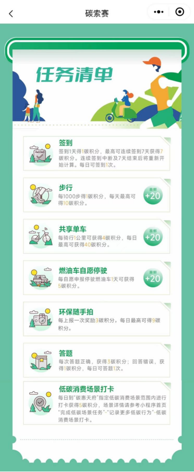 “出行碳索賽”作為亮點活動之一,更是讓人眼前一亮。10日25日起,通過微信進入“碳惠天府”小程序,踐行包括每日步行、騎共享單車、自愿停駛?cè)加蛙嚒h(huán)保隨手拍、低碳消費場景打卡等多種綠色低碳任務(wù),均能獲得相應的碳積分。