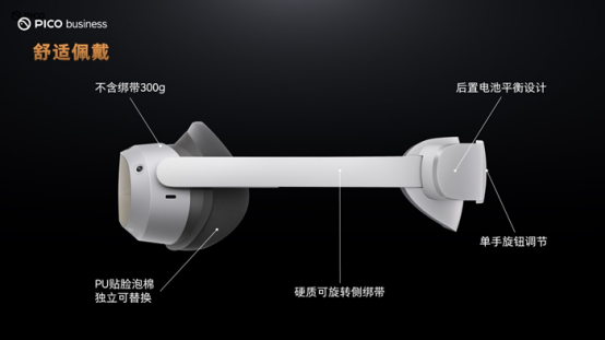 PICO 4 Enterprise采用一體化輕薄機(jī)身設(shè)計(jì),符合人體工學(xué),久戴也舒適。機(jī)身不含綁帶僅重300g,只比一臺(tái)常規(guī)的智能手機(jī)重一點(diǎn),采用后置電池平衡設(shè)計(jì)和硬質(zhì)可旋轉(zhuǎn)側(cè)綁帶,支持單手旋鈕調(diào)節(jié),大大優(yōu)化了用戶長(zhǎng)時(shí)間佩戴的體驗(yàn)。值得一提的是,PICO 4 Enterprise專為企業(yè)級(jí)用戶設(shè)計(jì)了獨(dú)立可替換的PU貼臉泡棉,相比布料的消費(fèi)者版,更適合多人使用,滿足長(zhǎng)時(shí)間佩戴的需求。