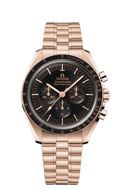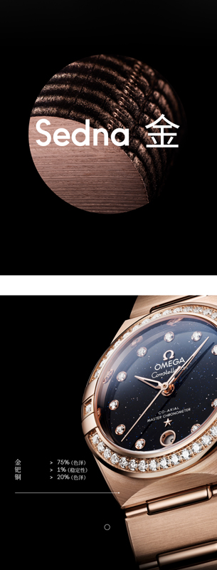 歐米茄研發(fā)的Sedna 18K金由金、銅和鈀三種金屬熔合而成,名字源于太陽(yáng)系中表面顏色最紅的Sedna小行星,銅的巧妙比例讓Sedna金色澤更柔和雅致,稀有金屬鈀則讓微紅的色澤更加穩(wěn)定,歲月更迭間盡顯華貴雅致風(fēng)范。