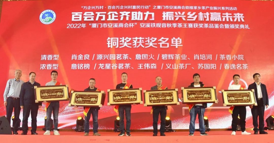 在當(dāng)晚舉行的茶王賽頒獎(jiǎng)典禮上,廈門市安溪商會(huì)為各位獲獎(jiǎng)?wù)哳C獎(jiǎng),為大賽的協(xié)辦和贊助企業(yè)頒發(fā)牌匾和證書。廈門市安溪商會(huì)為茶王賽設(shè)置獎(jiǎng)金高達(dá)百萬元,大賽的舉辦,得到商會(huì)數(shù)十家會(huì)員企業(yè)的鼎力支持。
