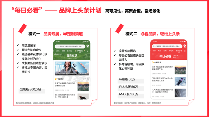 針對(duì)新品強(qiáng)勢(shì)宣發(fā)的訴求,今日頭條的“定制頻道”可以讓新品穩(wěn)穩(wěn)“C位出道”。定制頻道采用組合式玩法,按照用戶閱讀瀏覽習(xí)慣,基于“曝光/種草/轉(zhuǎn)化”打造“頻道LOGO冠名+必看文章+品牌好物+推薦視頻”等分梯度場(chǎng)景化資源包,逐層講透品牌和產(chǎn)品價(jià)值,促進(jìn)品牌影響力傳播的最大化。