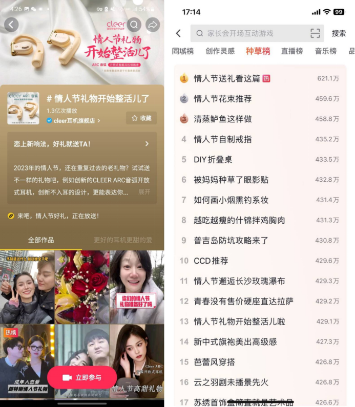 在情人節(jié)期間,Cleer耳機(jī)打造#情人節(jié)開始整活了#熱點(diǎn)話題營(yíng)銷,帶動(dòng)不同層級(jí)的達(dá)人共創(chuàng)內(nèi)容,形成高熱話題,鼓勵(lì)用戶一起來“接?!薄巴婀!?#xff0c;在全民“追熱點(diǎn)”的過程中,全面引爆了品牌種草熱度。數(shù)據(jù)顯示,話題最終登陸種草榜13位,曝光達(dá)1.3億。