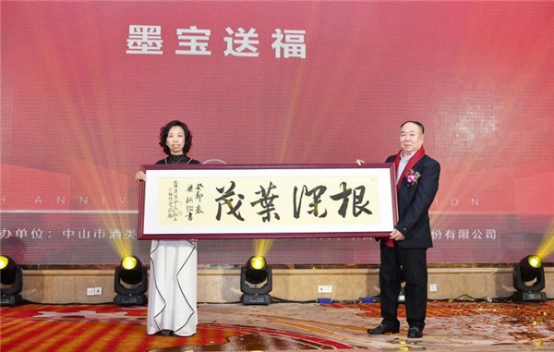 值此交接時(shí)刻,伍倩雯向第四屆會(huì)長(zhǎng)藍(lán)漢昌贈(zèng)出名家墨寶《根深葉茂》,向藍(lán)會(huì)長(zhǎng)八年來的無私奉獻(xiàn)、為酒協(xié)發(fā)展打下的深厚基礎(chǔ)致以深深的敬意和祝福。