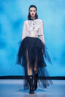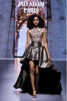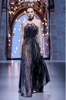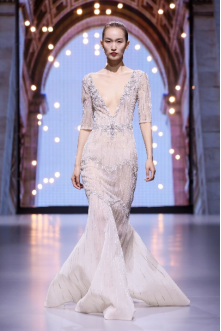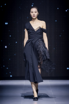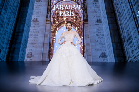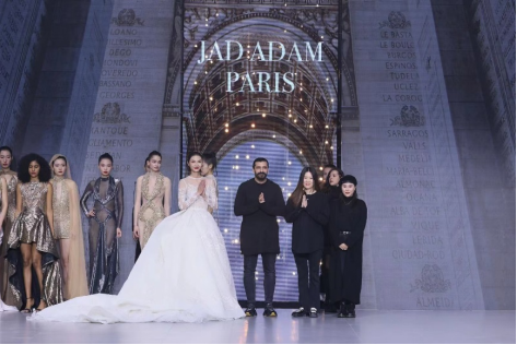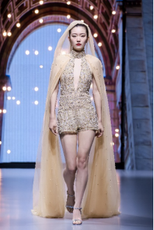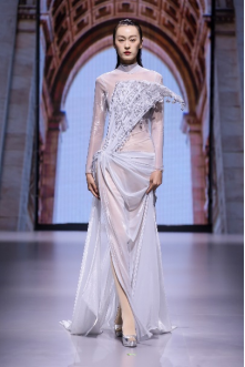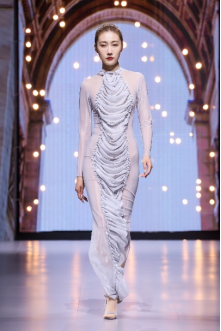 在充滿異域風(fēng)情的“巴爾米拉女王”主題發(fā)布中,法國高定女裝設(shè)計師JadAdam攜手紹興永耀紡織品有限公司、紹興晶遠創(chuàng)意設(shè)計有限公司展現(xiàn)了尋找內(nèi)心平靜的啟蒙之旅的獨特過程。設(shè)計師從柯橋優(yōu)秀的面料中獲得啟發(fā),在華麗的禮服裙中采用了大量的刺繡及繡片繡珠工藝。兩家企業(yè)提供的閃光高密度歐根紗、銀色金屬絲、清透網(wǎng)眼等面料,花型立體簡潔、色彩透亮多變,為設(shè)計師帶來了豐富的靈感。從晚禮服、婚紗到高級時裝,JadAdam通過特有的藝術(shù)表現(xiàn)手法詮釋了本次禮服設(shè)計。