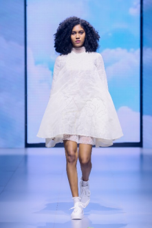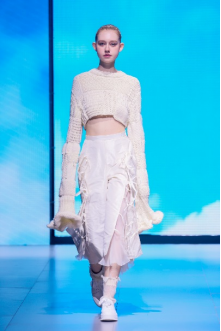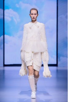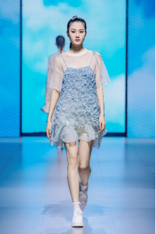 在“童年”主題秀演中,法國設(shè)計師聯(lián)袂浙江懿紗紡織科技有限公司、紹興柯橋豐旺紡織品有限公司,圍繞兒童的藝術(shù)、回到學(xué)校、童年的回憶三個子主題,共同演繹了童年的懷舊故事。設(shè)計師以精細的絎縫、印染、明線縫紉及自然著色的效果制作服裝和圖案,在工藝上采用了法國特有的編織技術(shù),并結(jié)合WALTZ系列花紗、三醋酸、錦滌歐根紗、六角硬網(wǎng)等面料輕薄有型、色彩飽滿的特色,最大程度實現(xiàn)了紡織工藝的價值化。特別是在傳統(tǒng)手工藝非遺、生態(tài)環(huán)保材料等系列元素的加持下,為整場秀演增添了可持續(xù)時尚的價值。