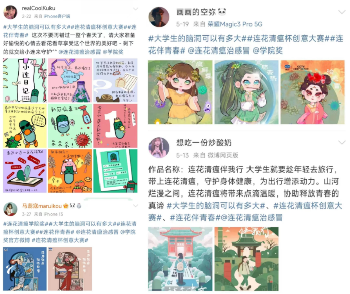 時(shí)代在發(fā)展,青年在進(jìn)步,創(chuàng)作新勢(shì)力隨著青年一代的熱血成長(zhǎng)也在持續(xù)擴(kuò)大聲量,此次征集到的創(chuàng)意作品高燃展現(xiàn)了Z世代的創(chuàng)意腦洞,賦能連花清瘟無(wú)限青春力量。