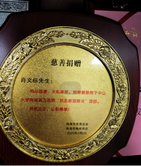 ▲珠海市慈善總會(huì)、珠海市梅州商會(huì)授予肖文標(biāo)的獎(jiǎng)牌