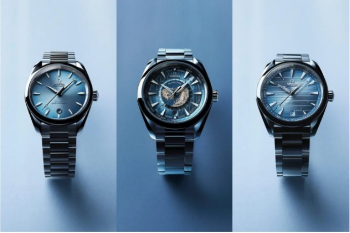 由左至右:歐米茄海馬 Aqua Terra腕表38毫米表款,Aqua Terra世界時(shí)腕表,Aqua Terra腕表41毫米表款