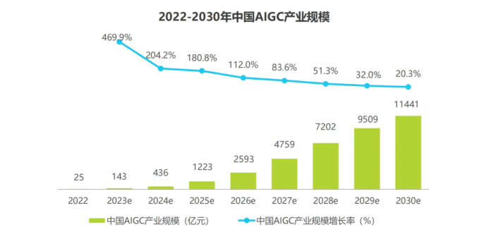 報(bào)告指出,2023年中國AIGC產(chǎn)業(yè)規(guī)模約為143億元,隨后進(jìn)入大模型培育期,持續(xù)打造與完善底層算力基建、大模型商店平臺(tái)等新型基礎(chǔ)設(shè)施,以此孕育成熟技術(shù)與產(chǎn)品形態(tài)并將其對外輸出。到2030年中國AIGC產(chǎn)業(yè)規(guī)模有望突破萬億元,達(dá)到11441億元。