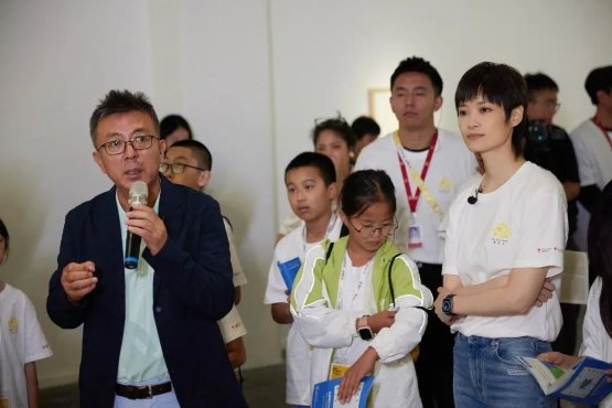 ▲李宇春、劉小東、喻紅向參加夏令營活動的師生發(fā)放藝術(shù)夢想包