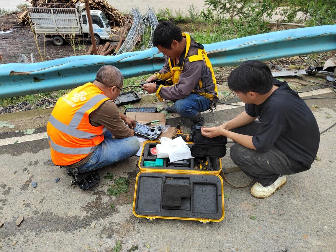 搶修人員徒步涉水,采取肩扛、手抬的方式冒著狂風(fēng)暴雨開展通信保障工作,采取緊急布防光纜、應(yīng)急發(fā)電、系統(tǒng)割接等措施,爭分奪秒修復(fù)受損通信設(shè)施,全力以赴保障通信暢通。