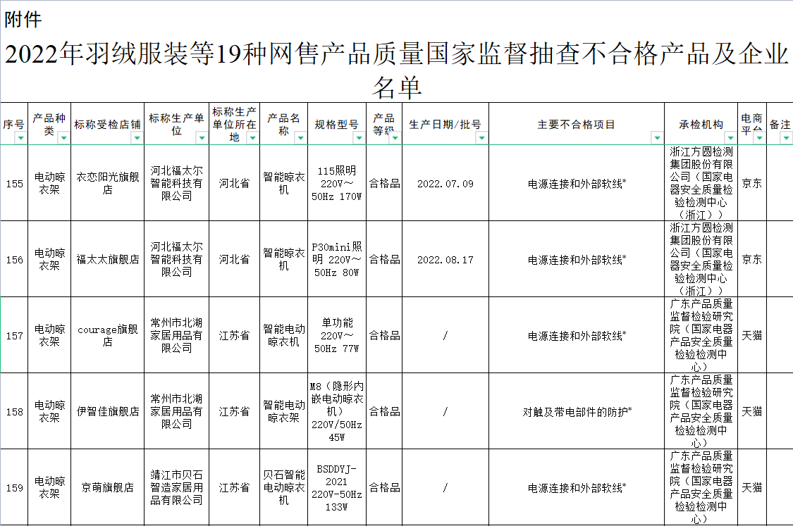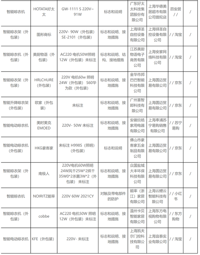 無獨(dú)有偶,據(jù)上海市市場監(jiān)督管理局發(fā)布的2022年上海市產(chǎn)品質(zhì)量監(jiān)督抽查結(jié)果(第十批)顯示,11批次智能晾衣架抽查不合格,其中涉及HOTATA好太太、美時(shí)美克EMOED、南極人等品牌。
