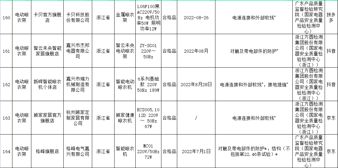 本次電動晾衣架抽查檢驗(yàn)9個省(市)48家企業(yè)生產(chǎn)的52批次產(chǎn)品,包括天貓、京東、拼多多、抖音等電子商務(wù)平臺,發(fā)現(xiàn)24批次產(chǎn)品不合格,涉及卡瑞琪(courage)、顧家、格峰、盼盼、歐蘭特等品牌。