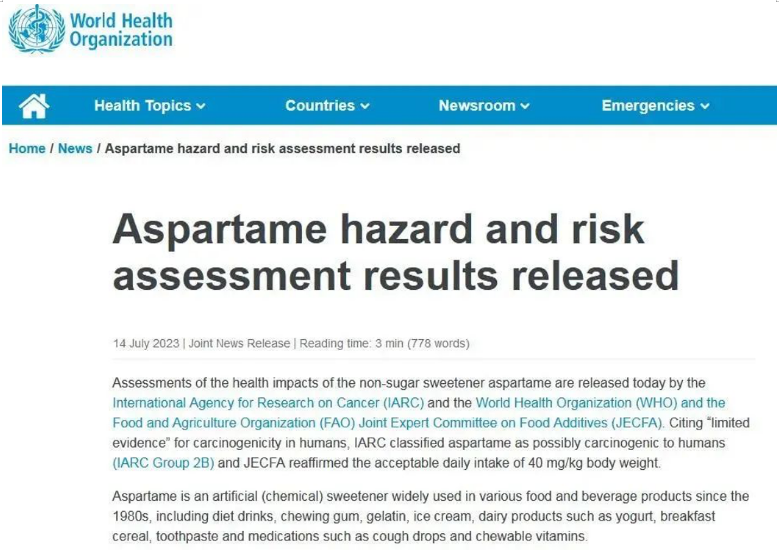 7月14日,世界衛(wèi)生組織(WHO)隸屬的國際癌癥研究機(jī)構(gòu)(IARC)和糧食及農(nóng)業(yè)組織食品添加劑聯(lián)合專家委員會(huì)(JECFA)公布了阿斯巴甜對(duì)健康影響的評(píng)估結(jié)果。